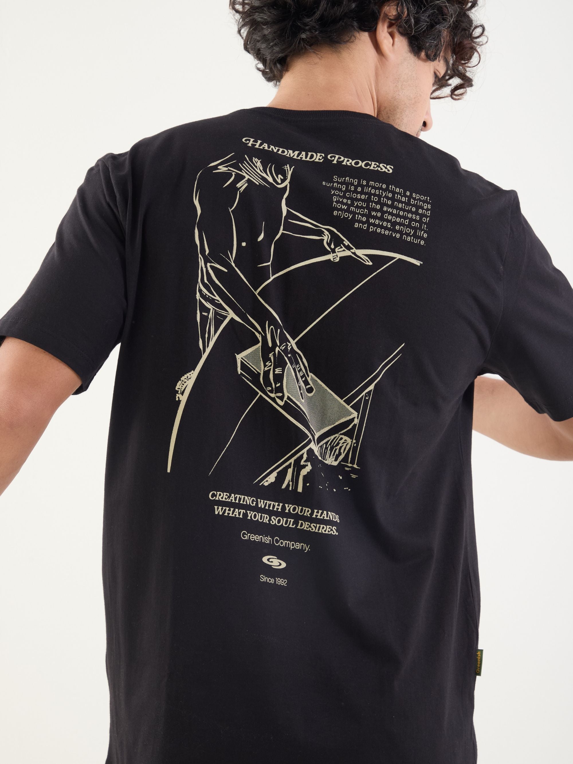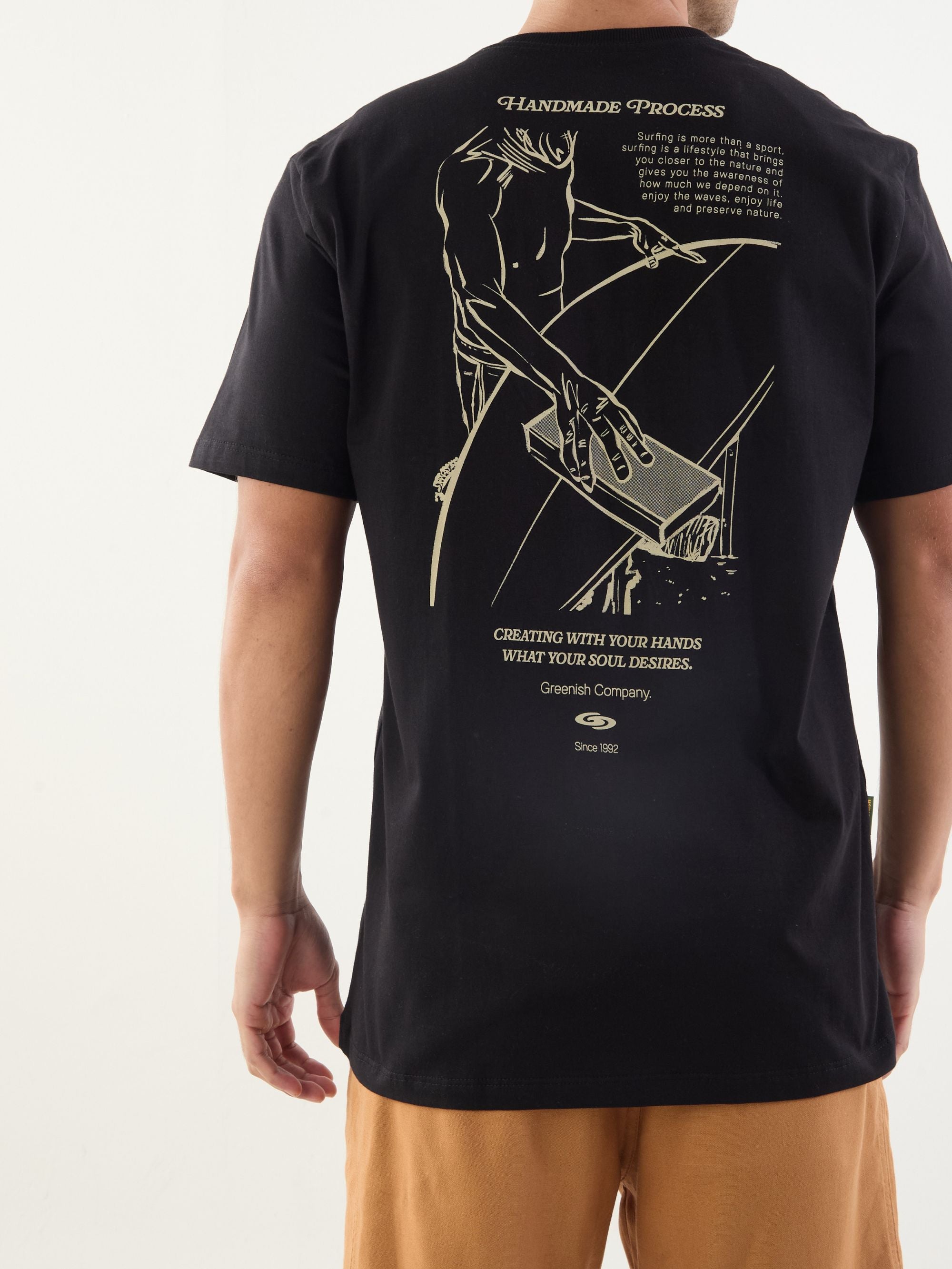 A Handmade Process é uma daquelas peças que carrega uma história — da criação artesanal de pranchas ao estilo de vida conectado com o mar e com o tempo. A estampa exclusiva nas costas mostra o shapeador em ação, enquanto a frente traz um detalhe sutil e cheio de significado. Um tributo à essência do surf.