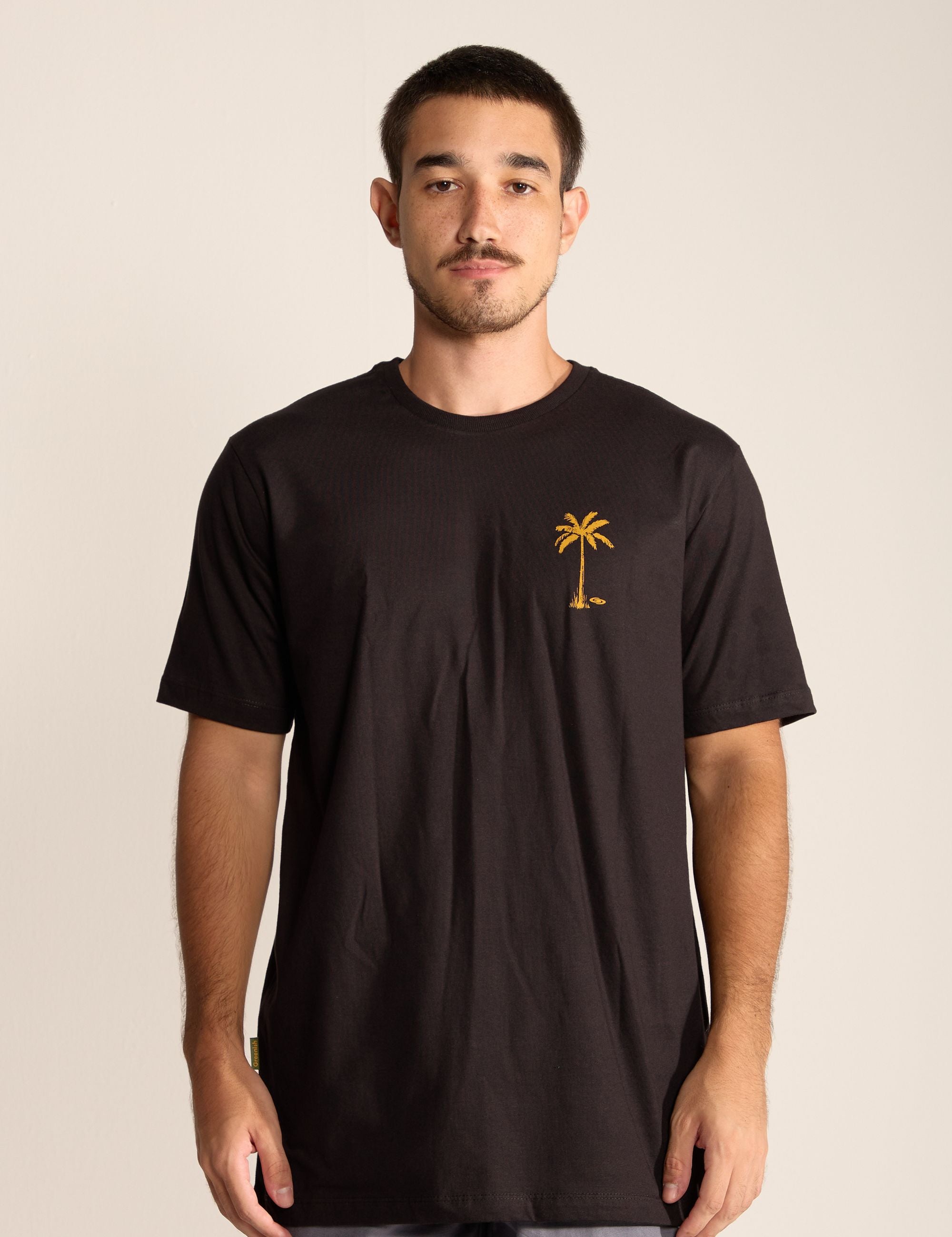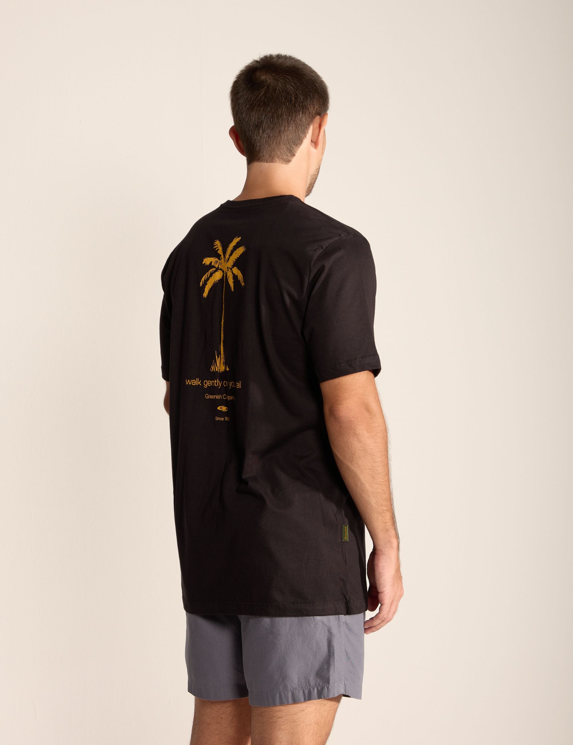 A Camiseta Palm Tree é feita em malha 100% algodão com toque macio e modelagem clássica, trazendo a estampa de uma palmeira acompanhada da frase “walk gently on your trail”, um convite à presença, ao respeito e à conexão com o natural.