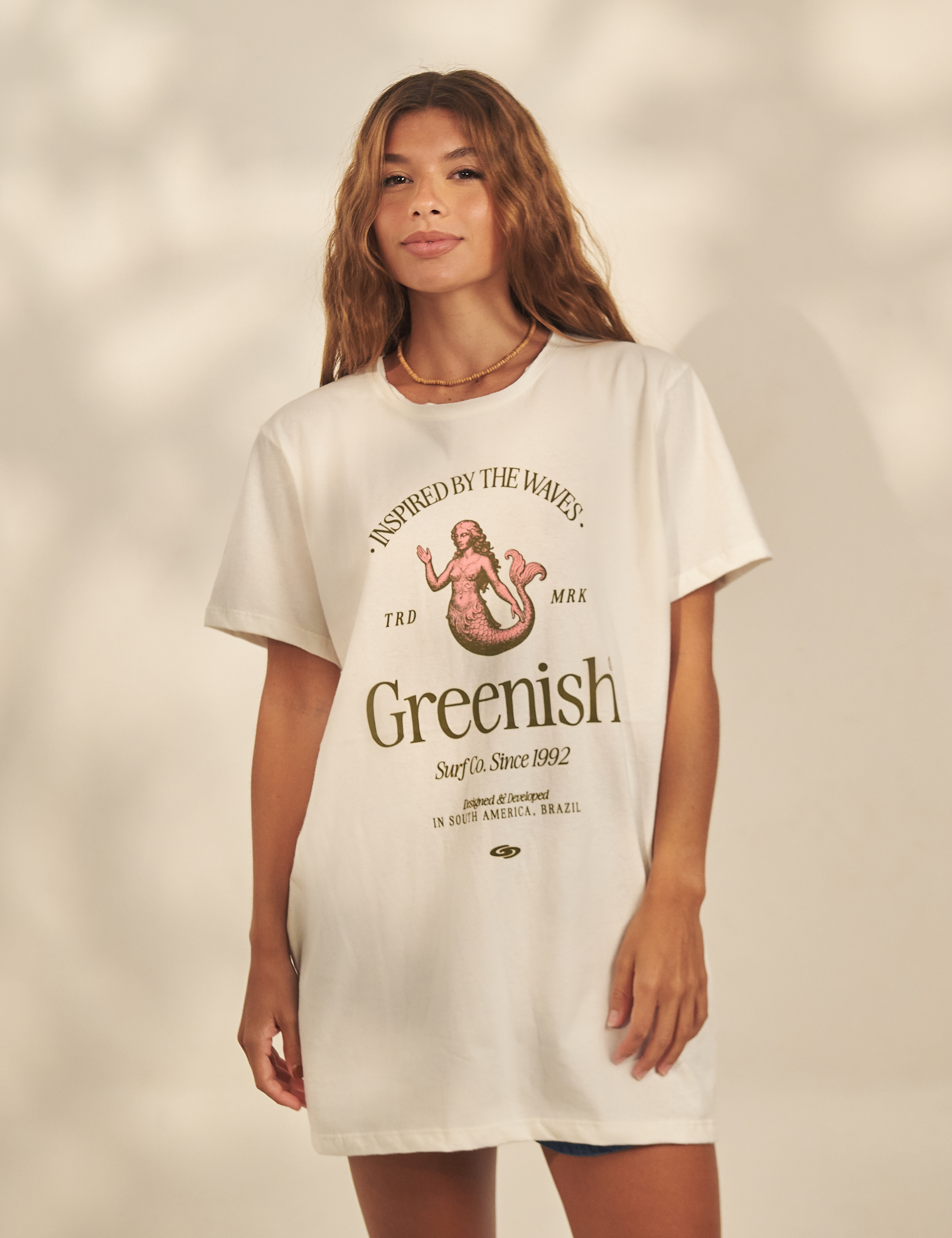 A Maxi Camiseta "Mermaid" tem shape amplo e é feita em malha 100% algodão com toque macio. A estampa com sereia Greenish traz um ar místico e tropical, ideal para os dias de sol, sal e liberdade.