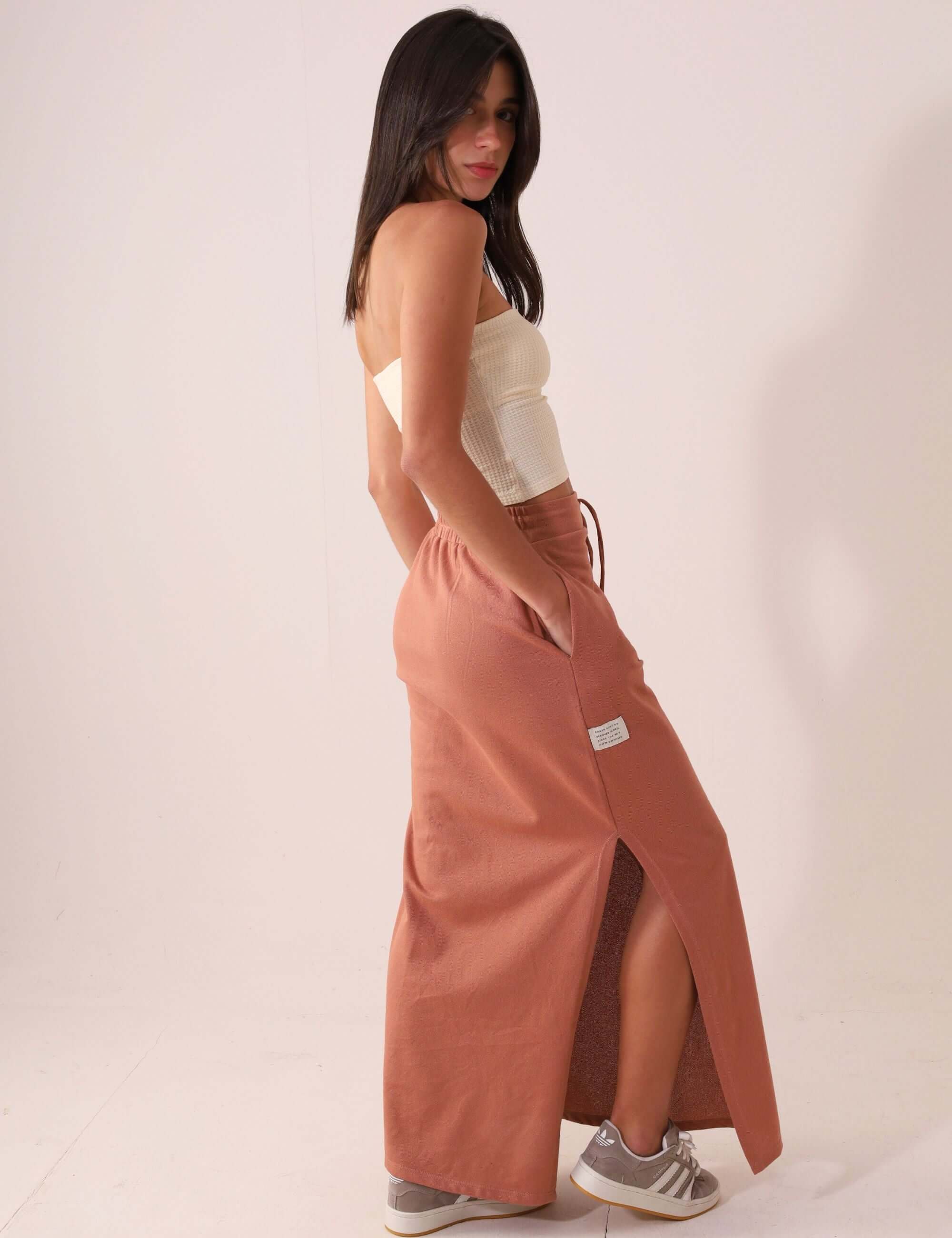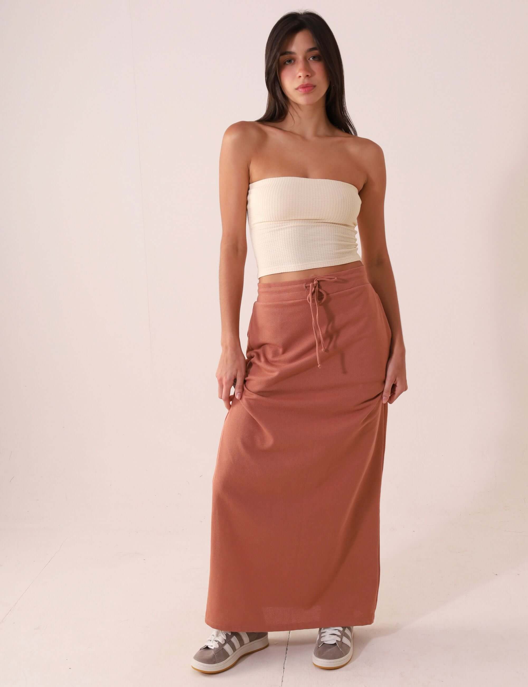 Saia midi de modelagem reta e comprimento abaixo dos joelhos, desenvolvida em malha canelada com alta elasticidade e toque macio, garantindo conforto e caimento ajustado ao corpo. O cós é confeccionado com canal elástico embutido e cadarço funcional, conferindo ajuste prático e visual despojado. Possui fenda lateral (somente no lado direito), que traz leveza ao caminhar e valoriza o shape.