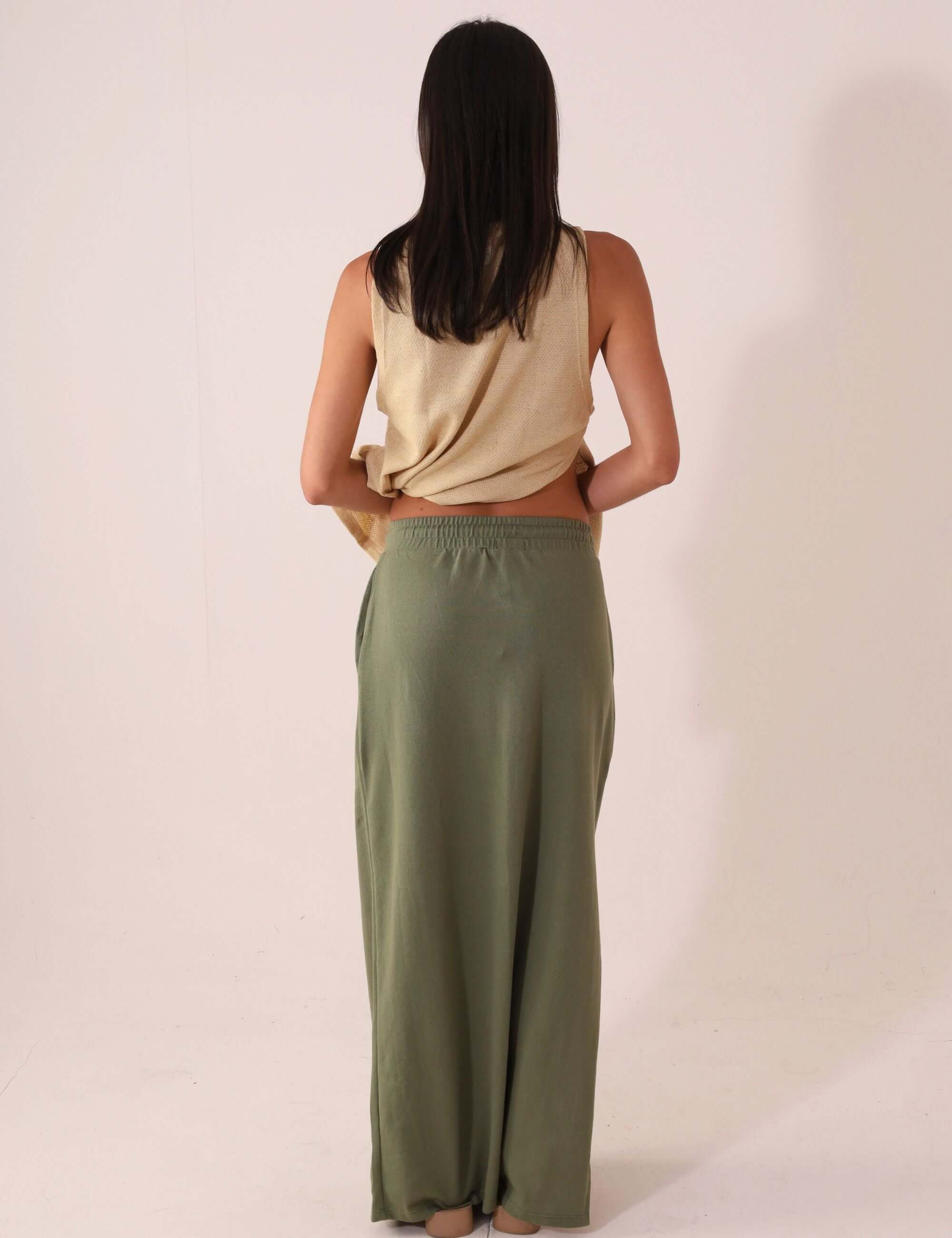 Saia midi de modelagem reta e comprimento abaixo dos joelhos, desenvolvida em malha canelada com alta elasticidade e toque macio, garantindo conforto e caimento ajustado ao corpo. O cós é confeccionado com canal elástico embutido e cadarço funcional, conferindo ajuste prático e visual despojado. Possui fenda lateral (somente no lado direito), que traz leveza ao caminhar e valoriza o shape.