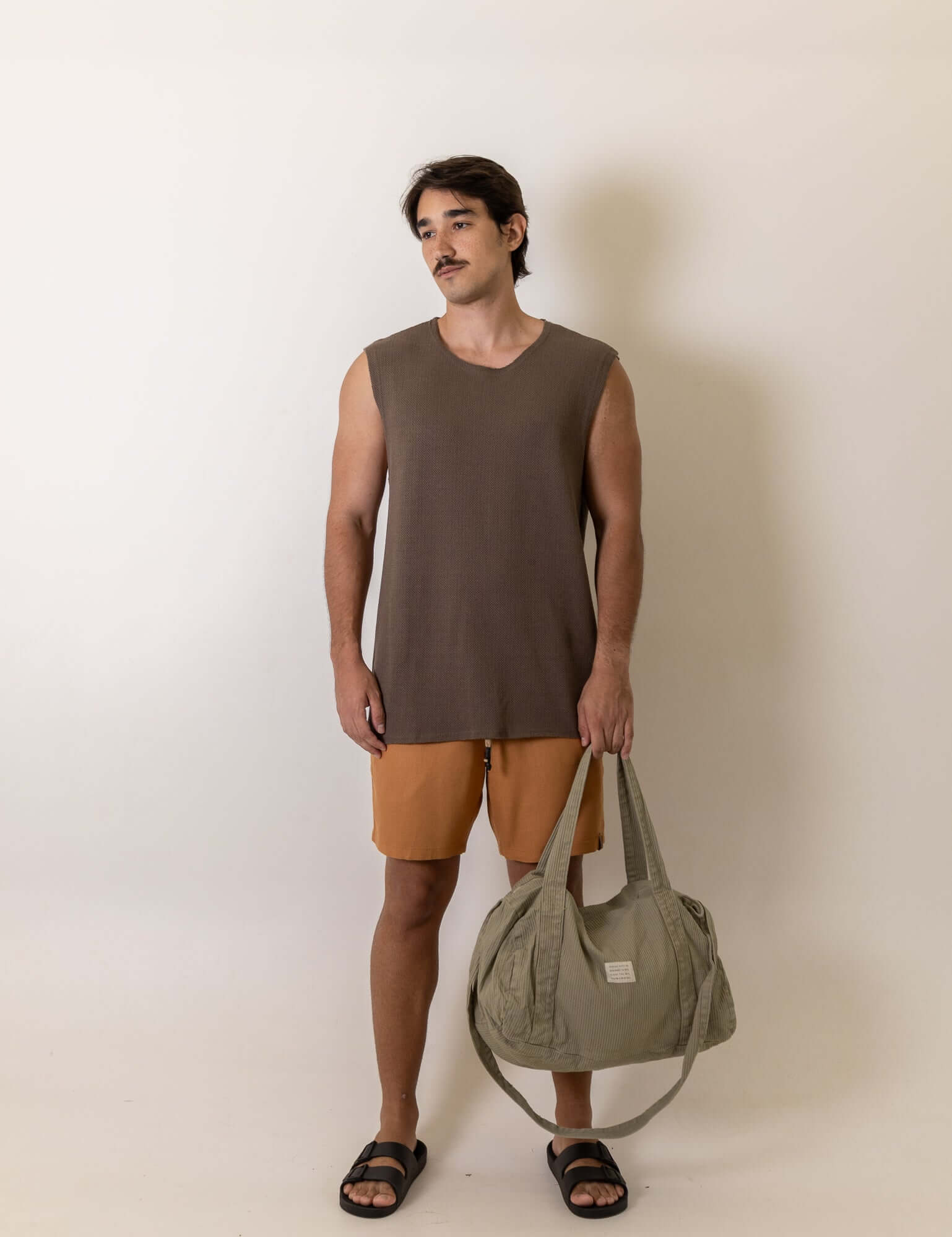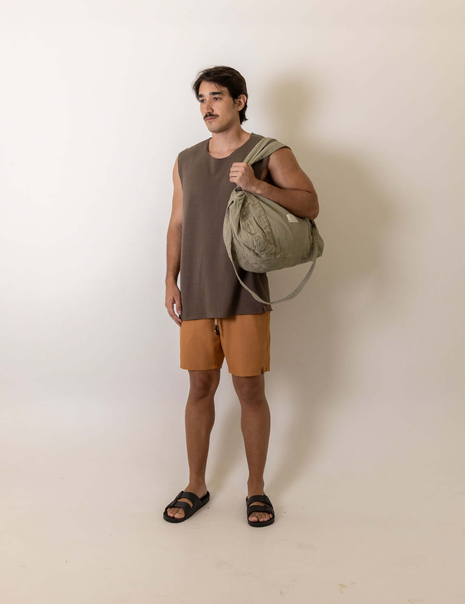 A Regata Maré tem modelagem ampla, acabamento a fio com rebater nas cavas e decote, e tecido com toque encorpado e confortável. Detalhe da etiqueta lateral clip traz identidade com sutileza.