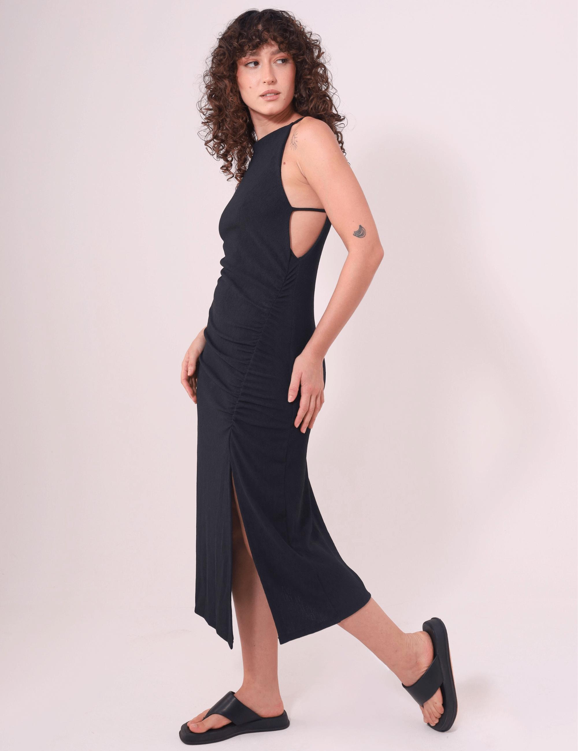 Com modelagem ajustada, franzido lateral e fenda que revela sem esforço, ele é feito em malha texturizada com toque macio e caimento fluido. Um decote reto, alças finas e fenda lateral garantem o equilíbrio entre o casual e o marcante.