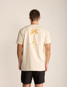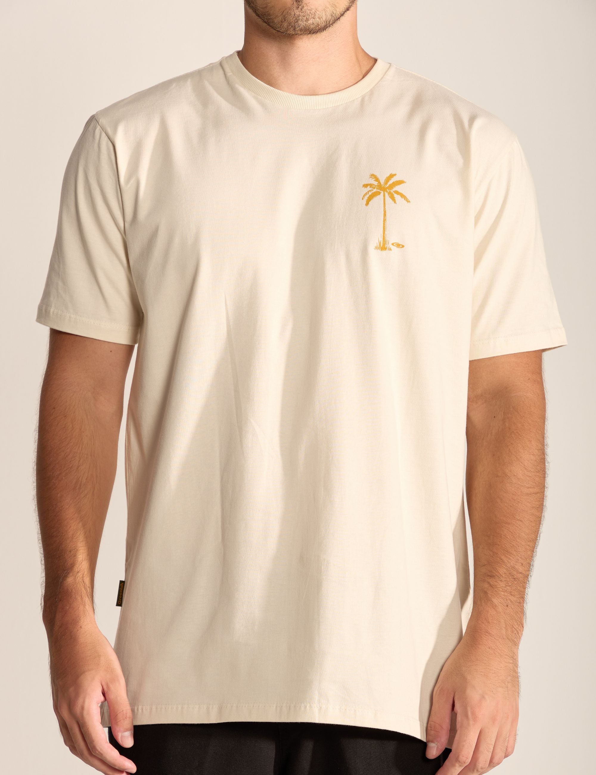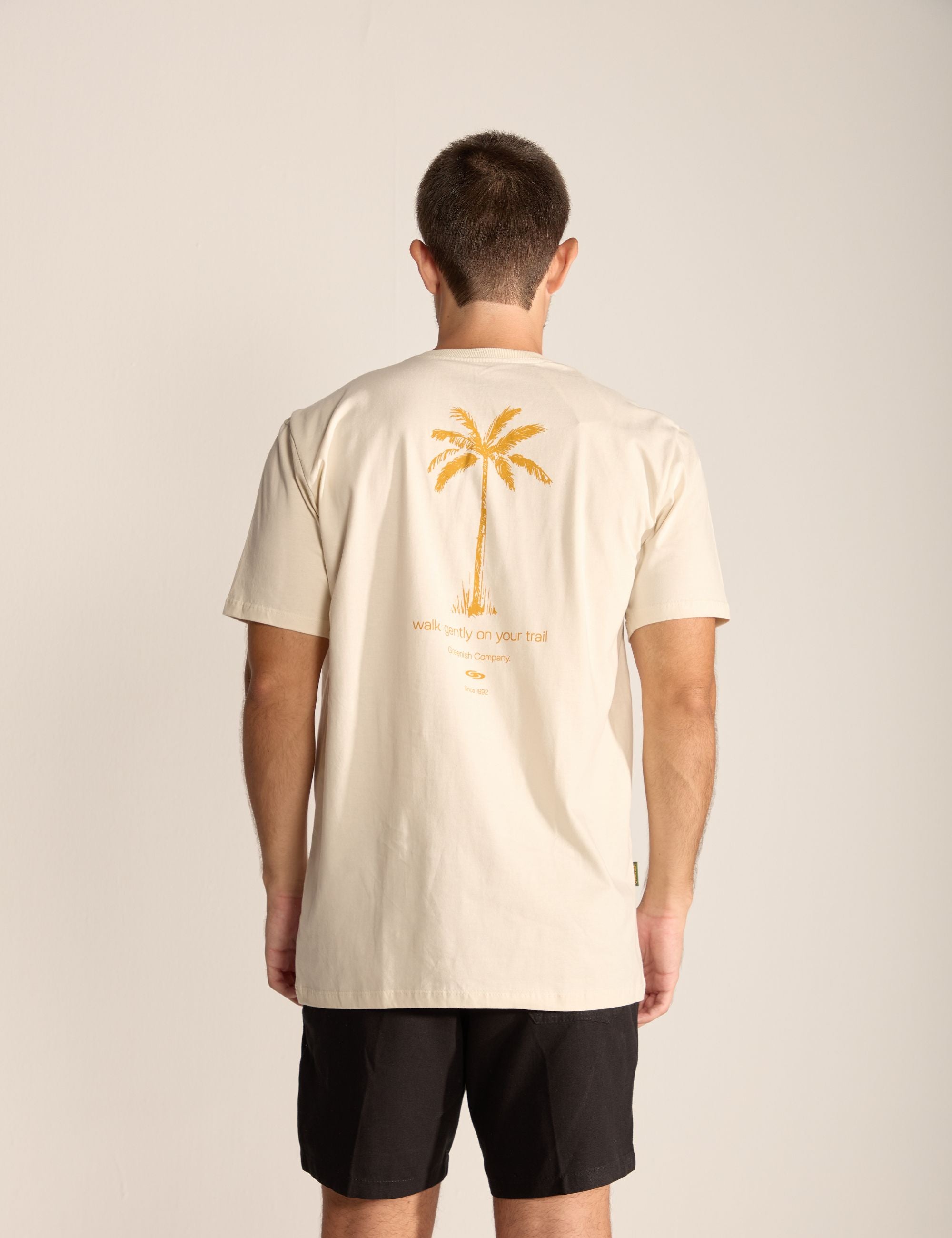 A Camiseta Palm Tree é feita em malha 100% algodão com toque macio e modelagem clássica, trazendo a estampa de uma palmeira acompanhada da frase “walk gently on your trail”, um convite à presença, ao respeito e à conexão com o natural.