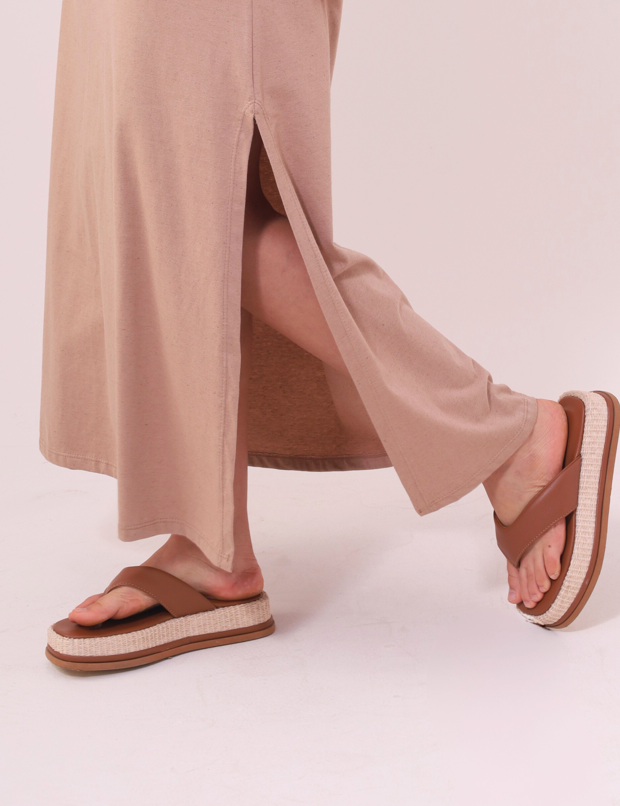 O detalhe de costas torcidas e as fendas laterais adicionam charme e liberdade ao caminhar. Um convite a viver sem pressa, do jeito que a Greenish acredita.